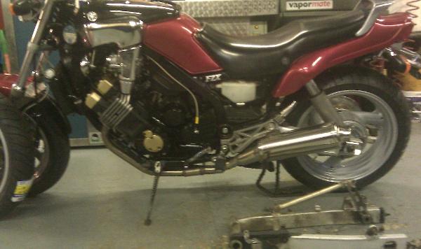 THESE BIKE GO PRETTY WELL BUT THAT,S WHERE IT ENDS, THEY DON'T HANDLE. SO THIS PROJECT IS TO MAKE IT HANDLE, THEN WE WILL TUNE IT. SO I,VE BEEN LOOKING ON EBAY AND OTHER SITES FOR AGES, TO FIND A REASSEMBLE ONE. THESE BIKES ARE PRETTY RARE NOW, SO TO FIND ONE IS NOT EASY. THEN ONE COMES ON EBAY IN GOOD CONDITION AND NOT TO FARE AWAY. SO I FOLLOW IT THE BIDDING ENDS AND NO ONE BIDDED SO I E-MAILED THE OWNER AND A DEAL WAS DONE, I PAID £850.00 WHICH I THOUGHT WAS A DEAL THE BIKE HAD A FULL LASER PRO STOCK STAINLESS EXHAUST IN ALMOST NEW CONDITION. SO I PICKED UP THE BIKE AND TO MY AMUSEMENT THE BIKE HANDLE JUST LIKE I REMEMBERED, WHICH WAS GOOD? OTHERWISE MY PLANS TO MAKE IT HANDLE WOULD HAVE BEEN WASTED! I WOULD JUST LIKE TO SAY THANK YOU TO ANDY WHO I BOUGHT THE BIKE OFF AND WHAT A RIDE HOME, THE ENGINE DIDN'T MISS A BEAT. ONLY MY HEART WITH THE HANDLING!(AND WE DIDN'T HANG ABOUT EITHER).